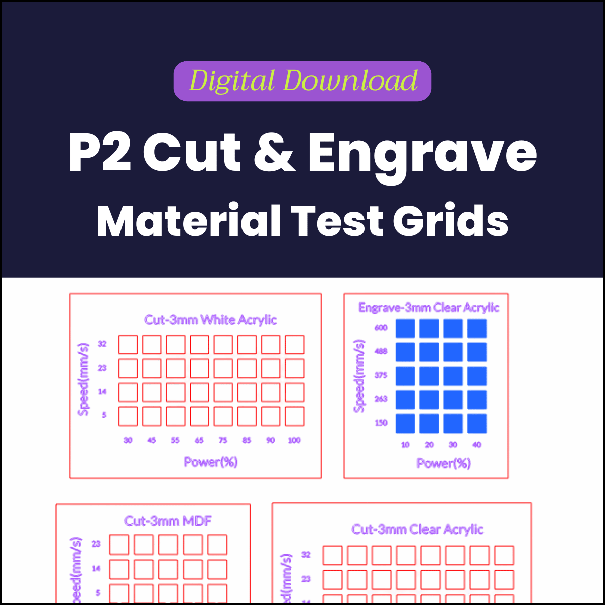 I've bundled all of my P2 material test grids for cutting and engraving into one downloadable file. Compatible with xTool Creative Space.